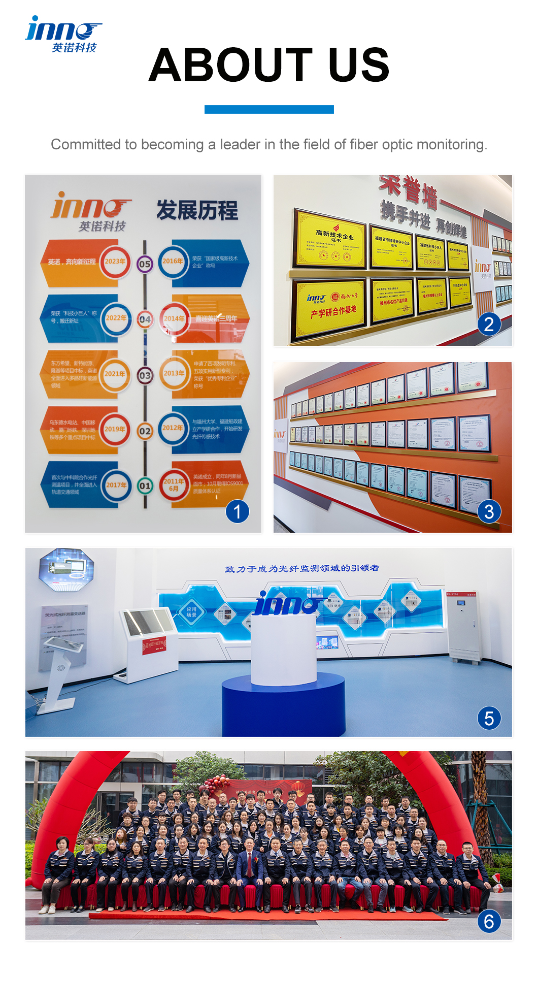 FJINNO هي الشركة المصنعة الوحيدة في الصين المتخصصة حصريًا في ذلك تقنية مراقبة درجة حرارة الألياف الضوئية الفلورية ل 15 اعوام. تمتلك الشركة عمليات تعبئة أجهزة استشعار عازلة ذات جهد عالي للغاية (تم اختباره لتحمل الجهد الكهربي 500 كيلو فولت) والبيئة المغمورة بالنفط تكنولوجيا براءات الاختراع الاستقرار على المدى الطويل (>25-سنة مختومة الحياة دون تسرب).